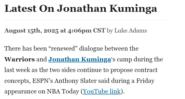 北京时间8月16日,勇士记者安东尼-斯莱特在最新节目中报道,过去一周,勇士队与乔纳森-库明加的团队重启了谈判,双方仍在就合同方案进行商议。